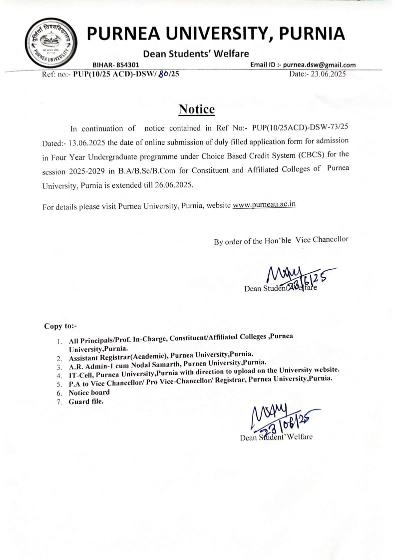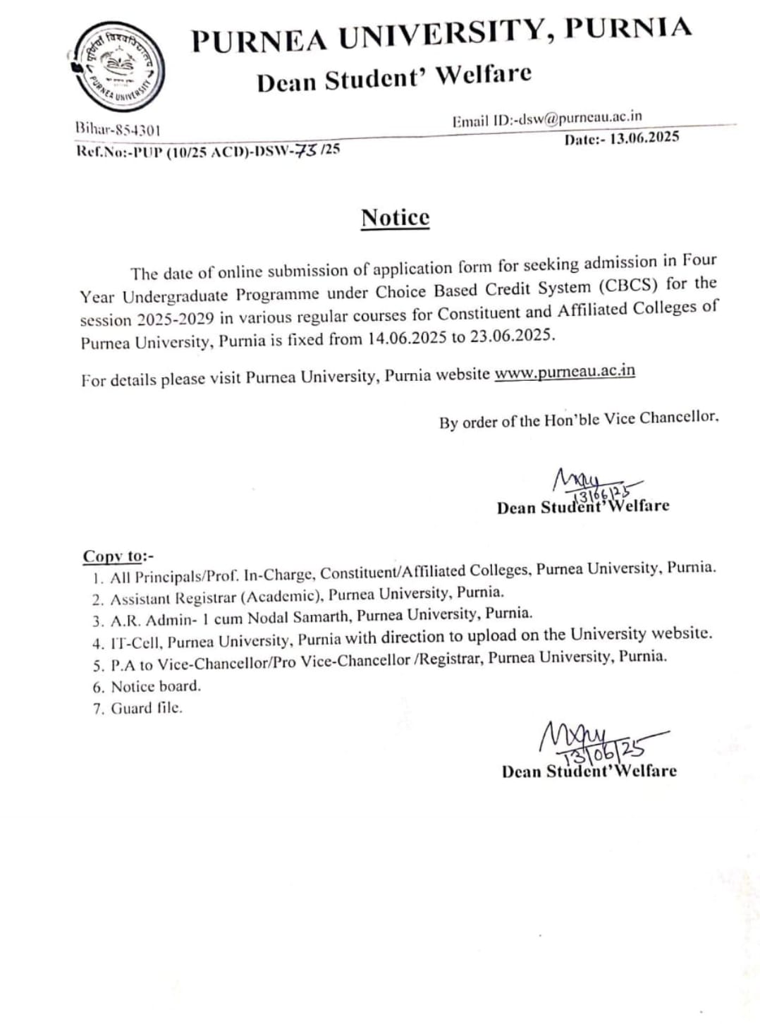 हालांकि आप सभी को बता दे की पूर्णिया विश्वविद्यालय यूजी ऐडमिशन 2025 को लेकर अभी तक आवेदन करने की तिथि तो जारी की गई थी लेकिन उसे स्थगित कर दिया गया है एडमिशन तिथि को फिर से विश्वविद्यालय के द्वारा नया तिथि जारी की जाएगी जिसमें Purnea University UG Admission 2025-29 Online Apply होगा।